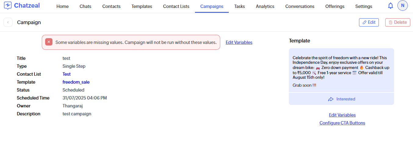 "Some variables are missing. Campaign will not be run without these values."