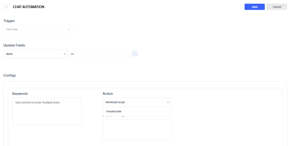 Configurations : Keywords are set to either terminate a script or unsubscribe from future messages. A reply message can also be set.