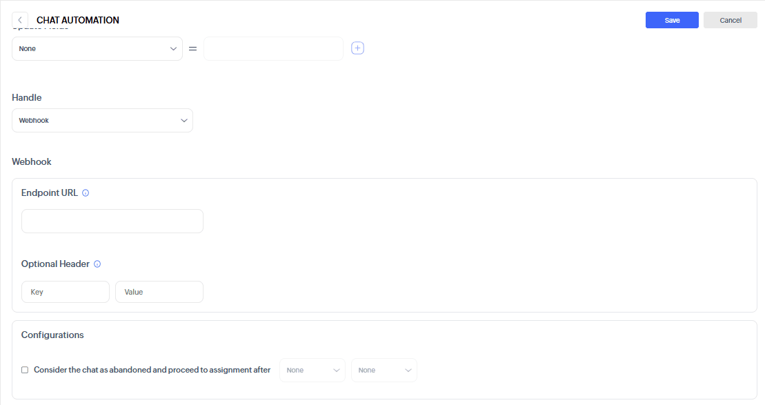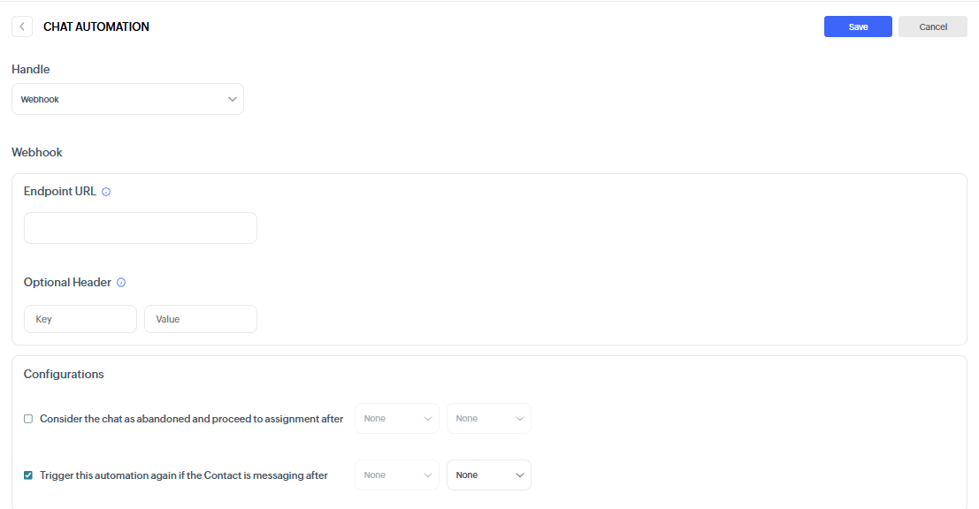 Webhook Automation allows you to trigger an external system in real time when a chat event occurs. In this setup, you configure an Endpoint URL where the chat data will be sent. You can also add optional headers (such as authorization keys) if required by your external service.
