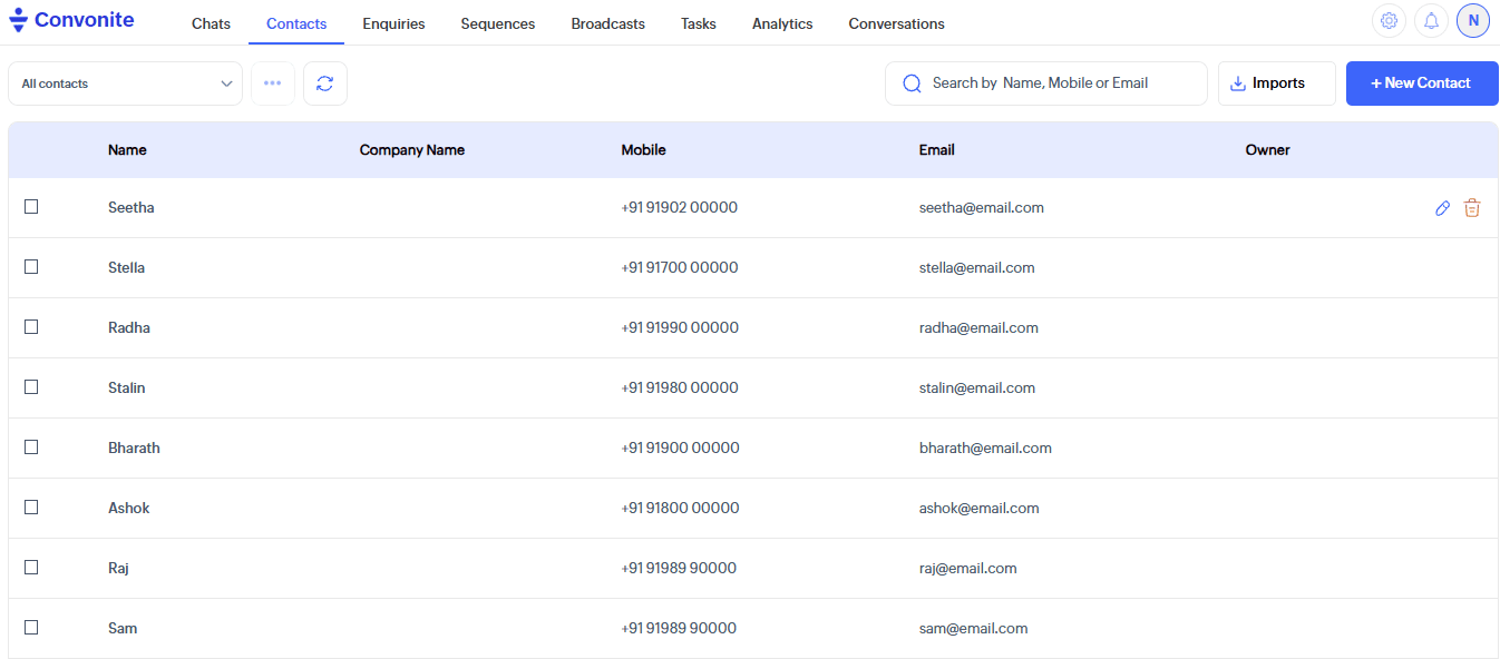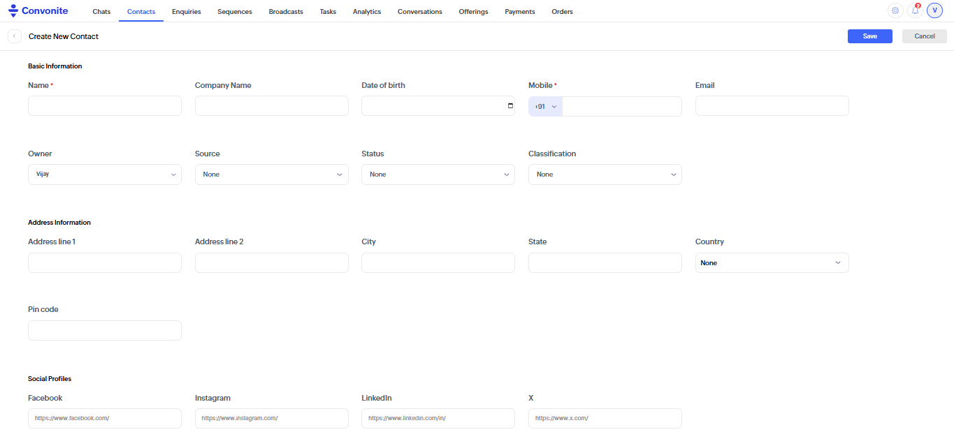 Example: If a new customer sends a WhatsApp message, Convonite will instantly register them as a Contact without requiring manual entry.
