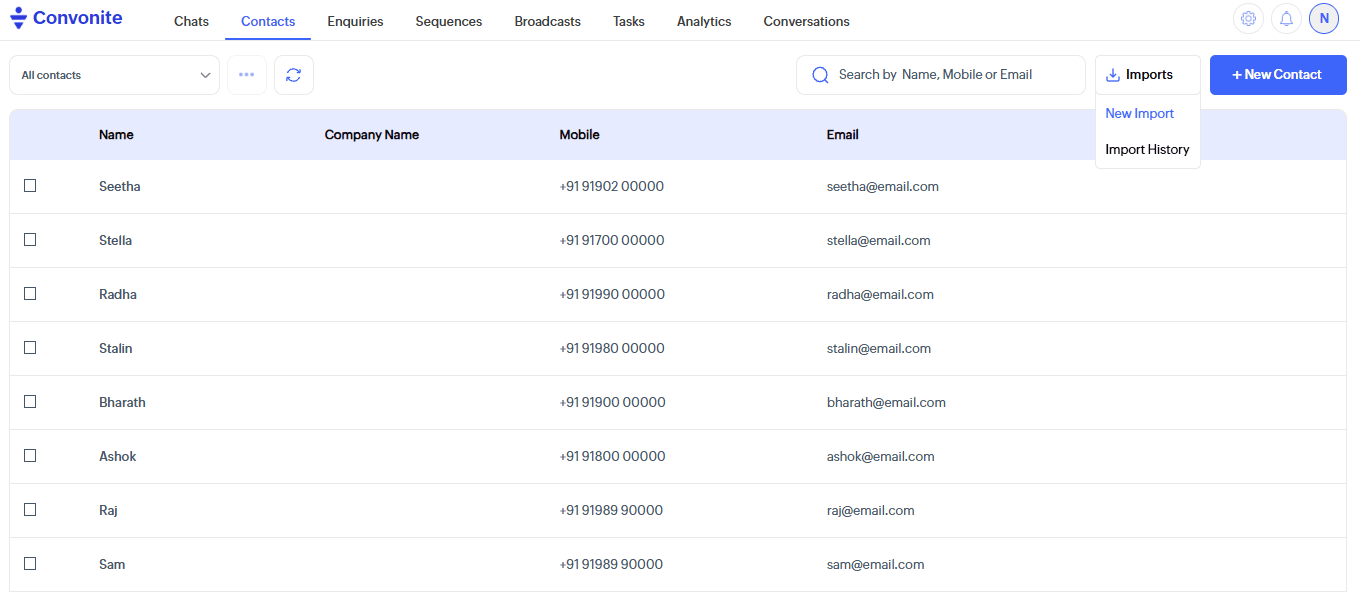 To import a file, click on the Import button in the Contacts tab (Note:CSV format supported)