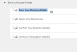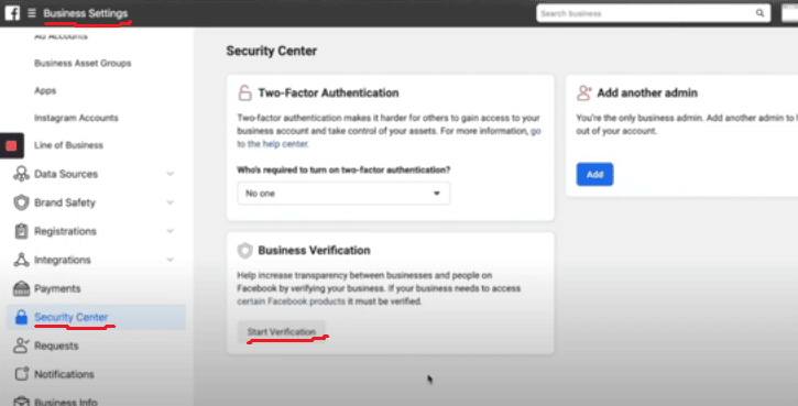 - Within the Security Center, look for the 'Verification' section and click on 'Start Verification'. Provide your business's details, including the legal business name, address, phone number and website.