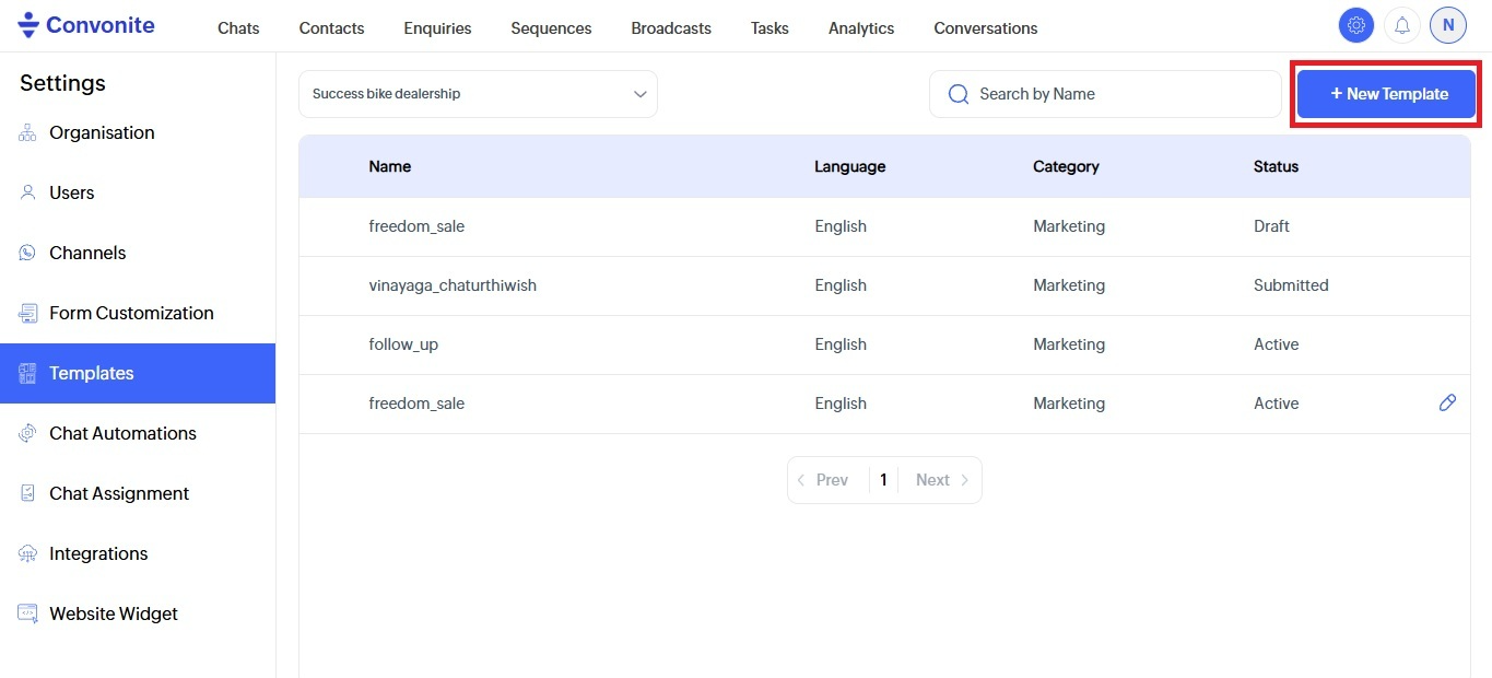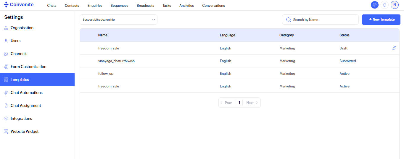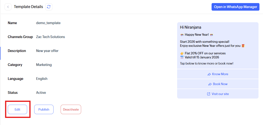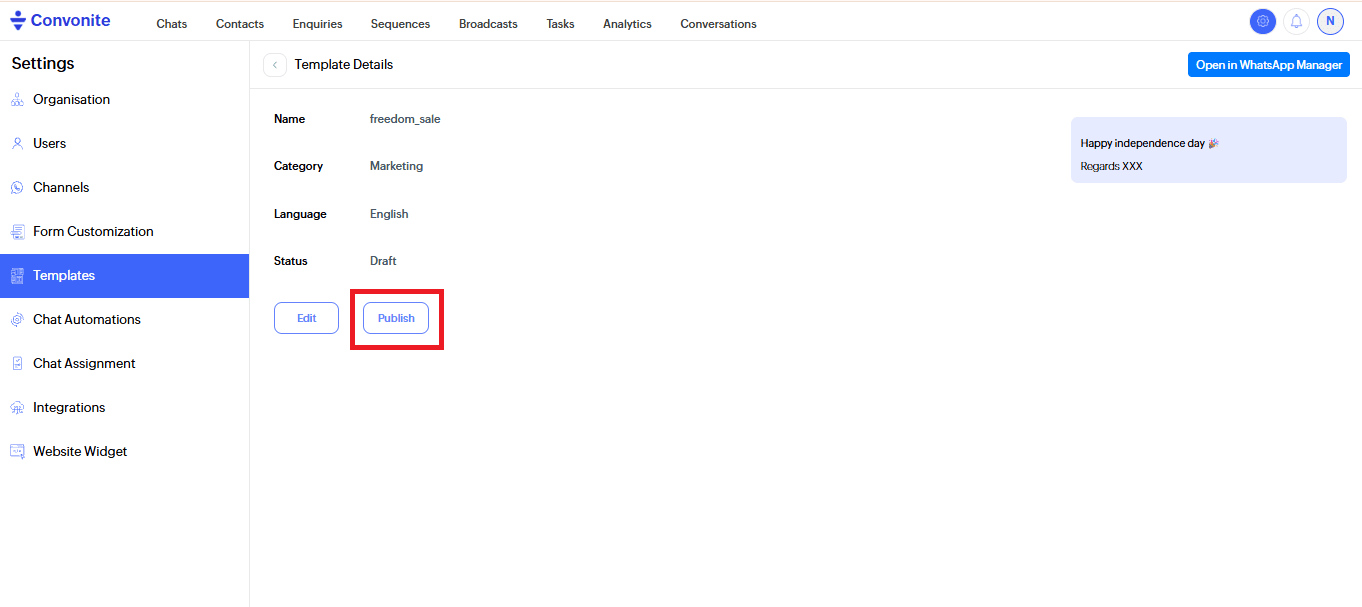 Once you publish, the template gets submitted for approval. Post approval, the template becomes active to send to individual contacts or a contact list.