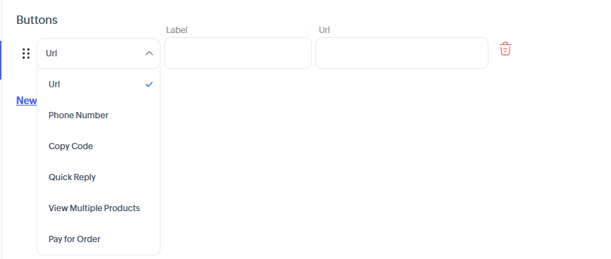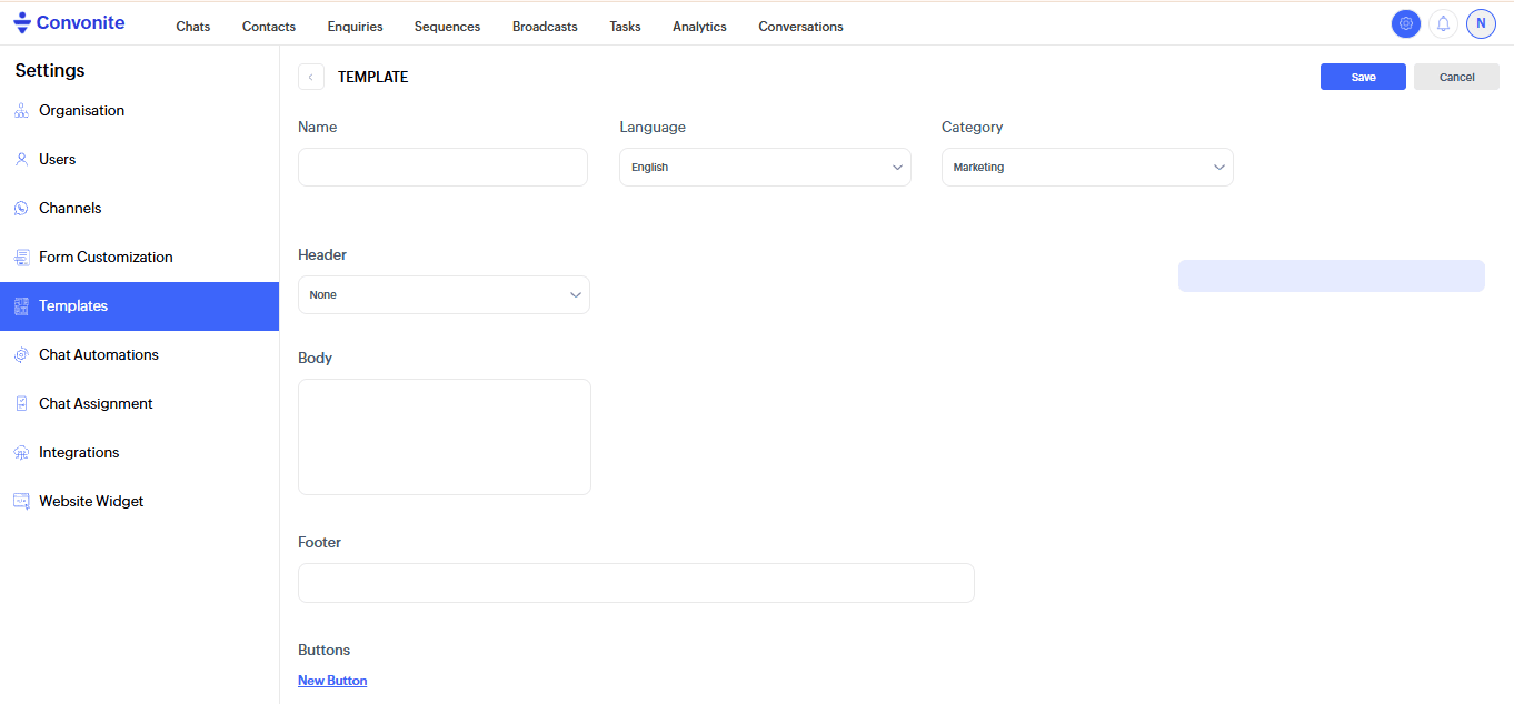 Buttons (Optional): You can add interactive buttons (e.g., quick reply or call-to-action) using the New Button option.