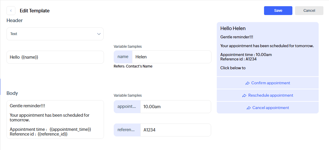 Here the variable 'name' is taken from the Contacts module and "appointment time' and 'reference id" are custom variables created for this particular template.